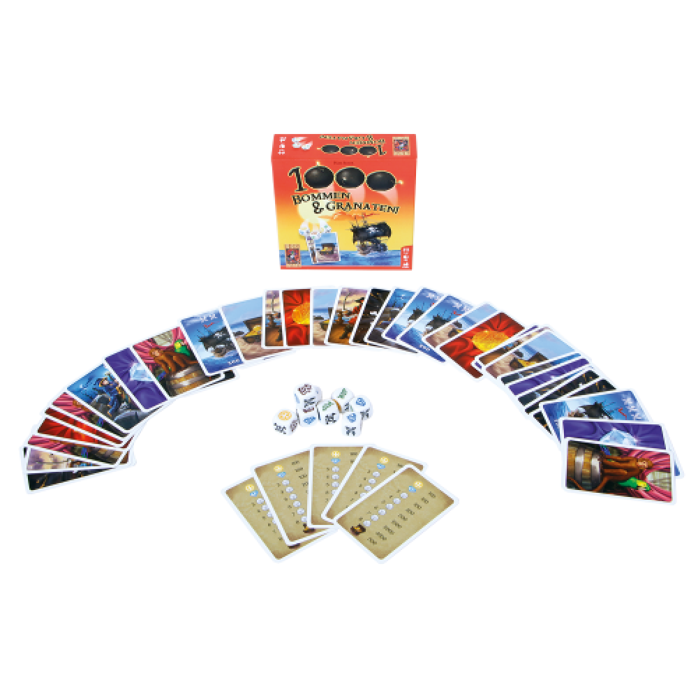 Dobbelspel met piratenthema. In 1000 Bommen en Granaten! probeer je met 8 dobbelstenen zoveel mogelijk gelijke symbolen te dobbelen. Je mag zo vaak opnieuw dobbelen als je wilt, maar schedels moet je opzij leggen. Gooi je een derde schedel, dan is je beurt direct voorbij en scoor je geen punten. Een piratenkaart geeft je mogelijkheden en beperkingen in je beurt aan. Hoe meer gelijke symbolen je gooit, hoe meer punten je scoort. Daarbij ontvang je nog extra punten voor goud en diamanten. Scoren al je dobbelstenen, dan krijg je nog een extra bonus. Gooi je met je eerste worp 4 of meer schedels, dan bezorg je de andere spelers minpunten. Wie als eerste een bepaald aantal punten heeft bereikt, wint het spel. 1000 Bommen en Granaten! is een eenvoudig dobbelspel, waarin je steeds moet kiezen tussen stoppen of doorgaan. Een spel voor de echte gokliefhebber!