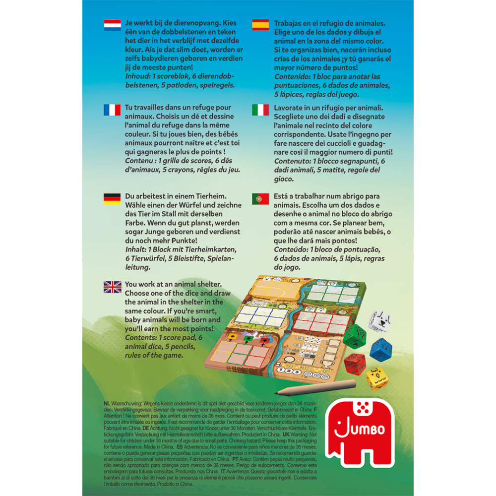 Je werkt bij de dierenopvang. Kies één van de dobbelstenen en teken het dier in het verblijf met dezelfde kleur. Als je dat slim doet, worden er zelfs babydieren geboren en verdien jij de meeste punten!