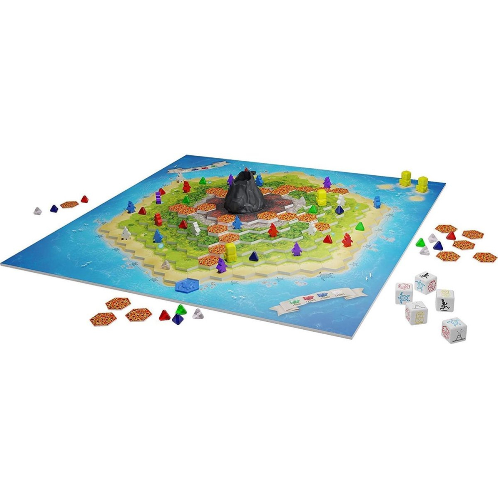 Het spelbord toont een vulkanisch eiland met verschillende zones en obstakels. De spelers moeten slim gebruik maken van de mogelijkheden en strategieën om hun pionnen zo dicht mogelijk bij de vulkaan te krijgen en edelstenen te verzamelen.
