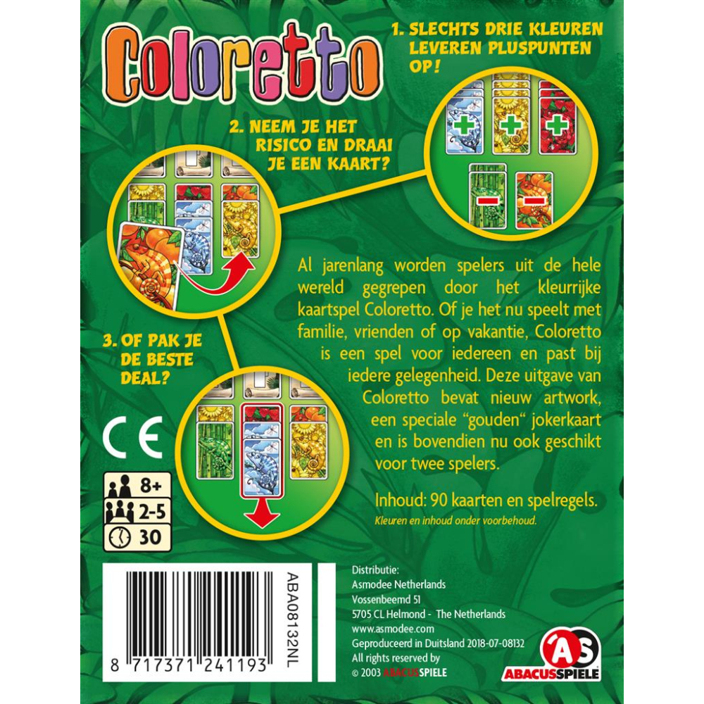 Jarenlang worden spelers uit de hele wereld gegrepen door het kleurrijke kaartspel Coloretto. Of je het nu speelt met familie, vrienden of op vakantie, Coloretto is een spel voor iedereen en past bij iedere gelegenheid. Doel van Coloretto is om de meeste punten te scoren door de juiste kleurenkaarten te verzamelen. Maar pas op: voor slechts 3 van jouw kleuren krijg je pluspunten, de andere kleuren geven minpunten. Deze vernieuwde Nederlandstalige uitgave van Coloretto bevat nieuw artwork, een speciale “gouden“ jokerkaart en maakt bovendien het spel nu ook geschikt voor twee spelers.