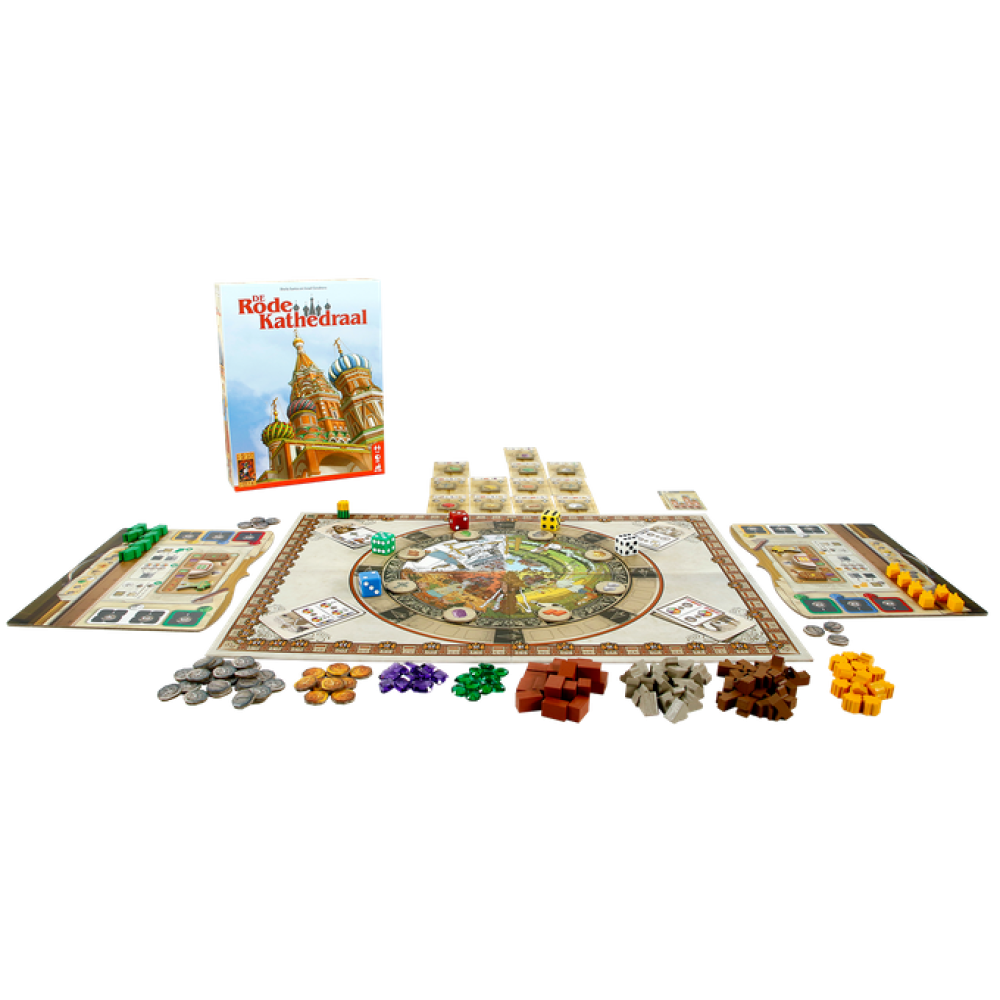 "De Rode Kathedraal" is een strategisch bordspel waarin spelers bouwteams leiden om St. Basil's kathedraal in Moskou op te richten. Leid jouw team, wijs secties toe, stuur middelen en voltooi de bouw, terwijl je je rivalen omzeilt. De tsaar kijkt toe en alleen de meest bekwame bouwer zal zijn gunst winnen. Met een prachtig eerbetoon aan de kunst van Ivan Bilibin biedt dit spel toegankelijke regels en diepgaande strategie voor uren speelplezier.