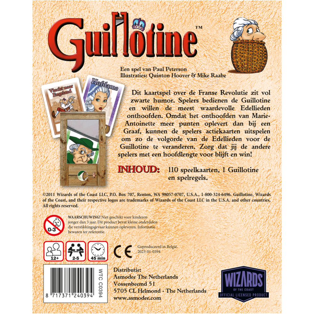 Guillotine is een kaartspel over de Franse Revolutie en zit boordevol zwarte humor. Spelers bedienen de Guillotine en willen de meest waardevolle Edellieden onthoofden. Omdat het onthoofden van bijvoorbeeld Marie-Antoinette meer punten oplevert dan bij een Graaf, kunnen de spelers actiekaarten uitspelen om zo de volgorde van de Edellieden voor de Guillotine te veranderen. Zorg dat jij de andere spelers met een 'hoofdlengte' voor blijft en win!... Leve de Revolutie!