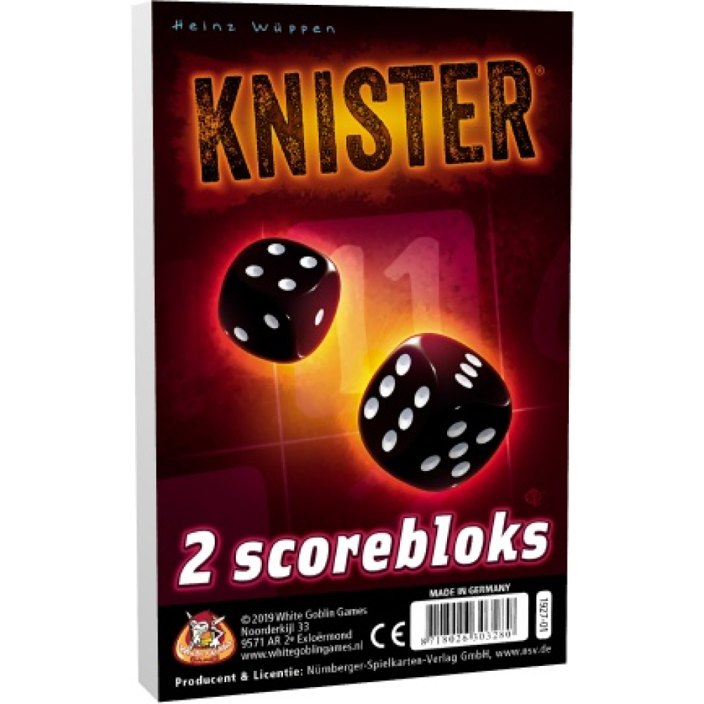2 extra scorebloks met 80 blaadjes per stuk (160 in totaal) voor het populaire dobbelspel KNISTER Leeftijd: 8+ Spelers: 3-10 Speelduur: 10 min