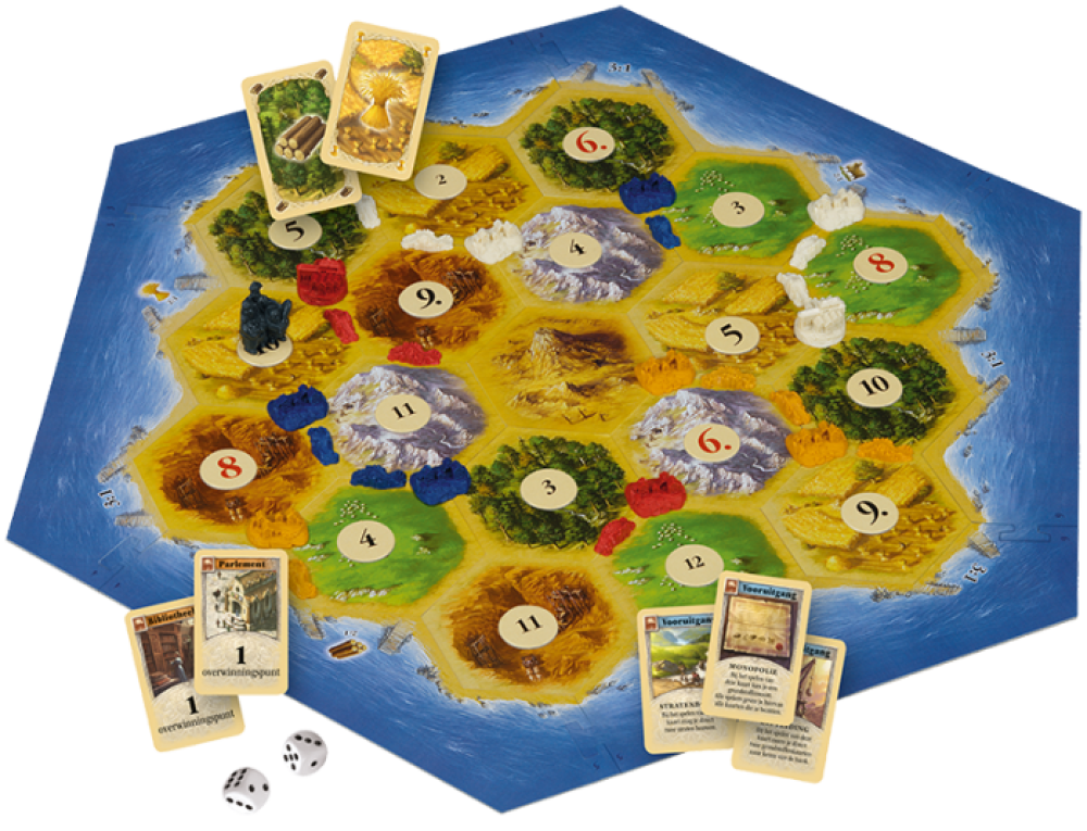 Dorpen en steden leveren niet alleen grondstoffen op, maar zijn ook punten waard. Ook ontwikkelingskaarten, de langste aaneengesloten route en de grootste riddermacht brengen punten binnen. Wie als eerste 10 punten heeft, wint het spel direct!