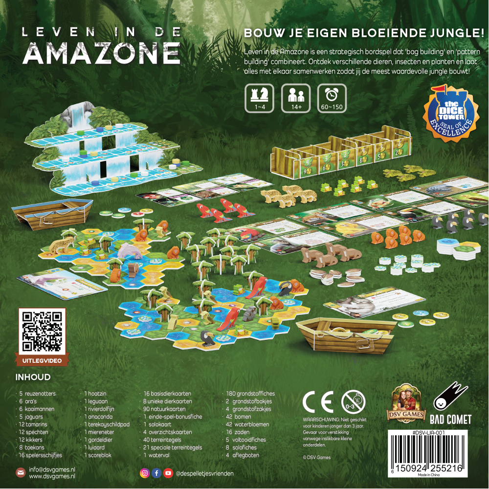 Leven in de Amazone is een strategisch bordspel dat ‘bag building’ en ‘pattern building’ combineert. Ontdek verschillende dieren, insecten en planten en laat alles met elkaar samenwerken zodat jij de meest waardevolle jungle bouwt!