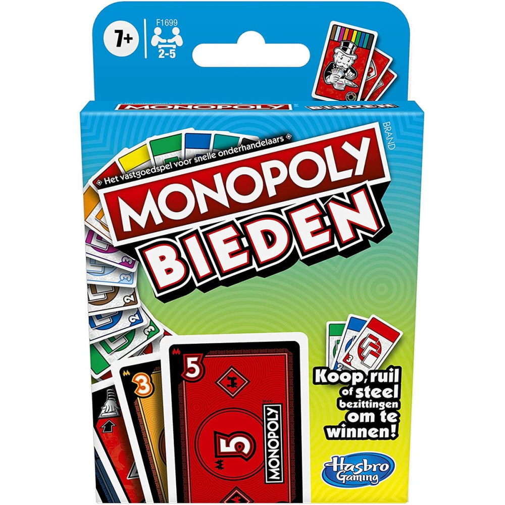 Ben je klaar voor een spannend Monopoly-kaartspel dat niet lang duurt? Het Monopoly Bieden kaartspel is een combinatie van toeval, geluk en strategie waarbij spelers bieden in blinde veilingen, betalen met geldkaarten, eigendommen stelen met actiekaarten en hun geluk doen keren met jokers. Tijdens de speelrondes krijgt iedereen de kans om een veiling te organiseren. Wanneer het tijd is om op een eigendom te bieden, kiezen spelers hoeveel geld ze willen riskeren. Dan roept iedereen: ‘1, 2, 3, Bieden!’ en leggen ze hun geldkaarten neer. De speler die het meeste geld heeft geboden, krijgt de eigendom.