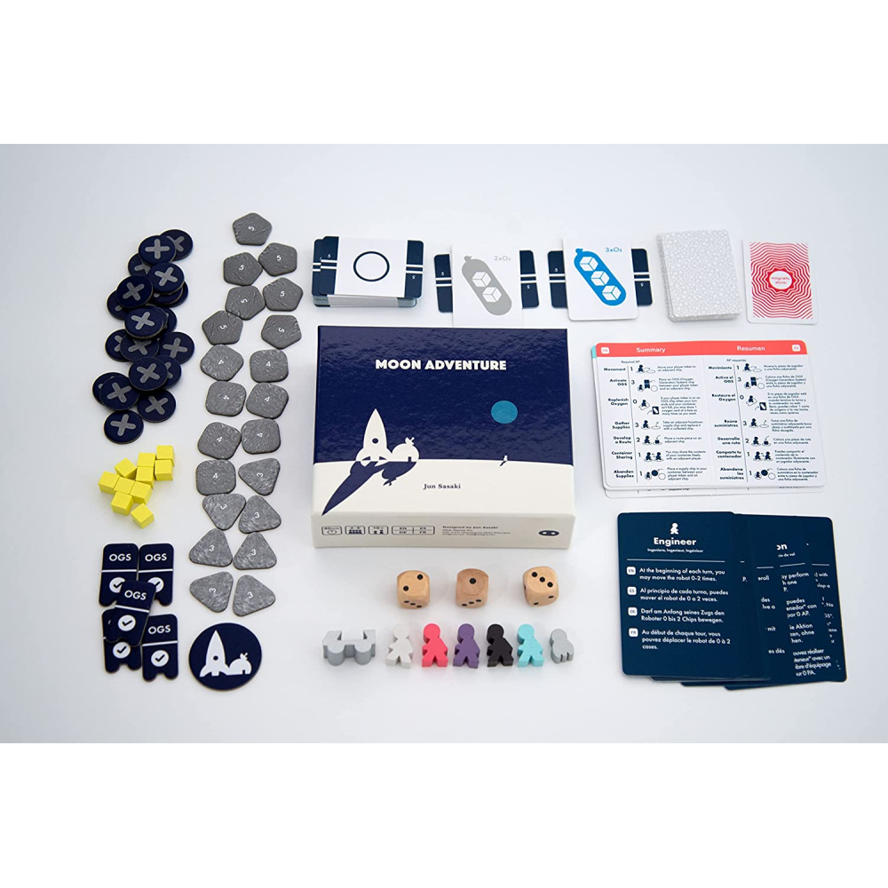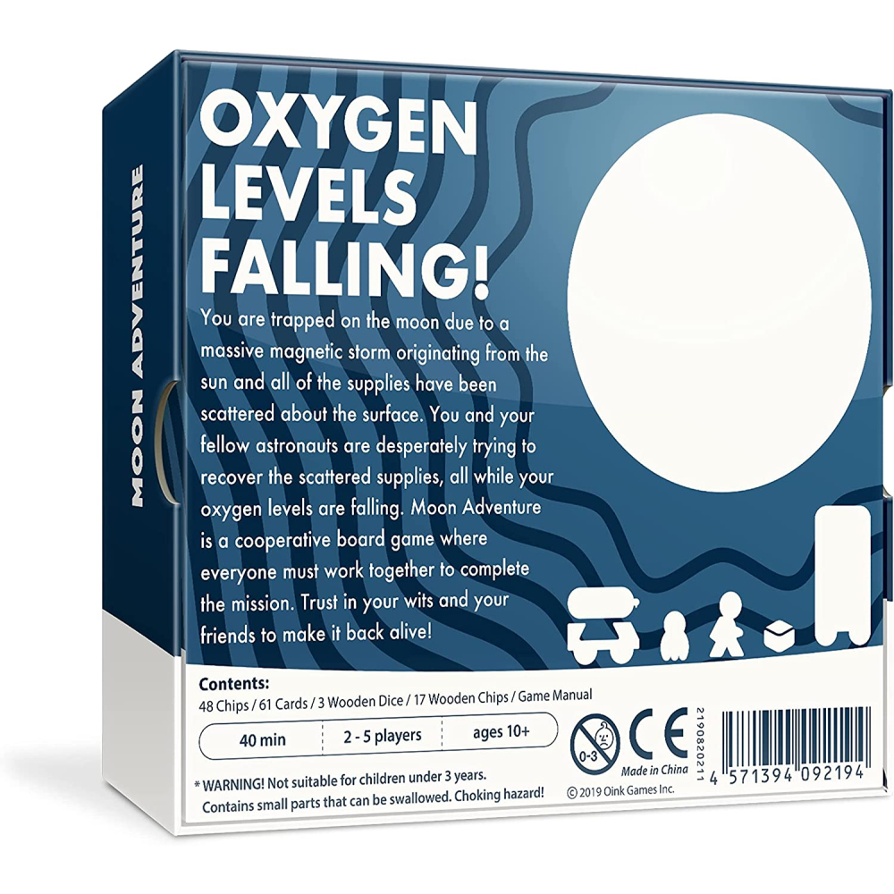 You are trapped on the moon due to a massive magnetic storm originating from the sun and all of the supplies have been scattered about the surface. You and your fellow astronauts are desperately trying to recover the scattered supplies, all while your oxygen levels are falling. Moon Adventure is a cooperative board game where everyone must work together to complete the mission. Trust in your wits and your friends to make it back alive!